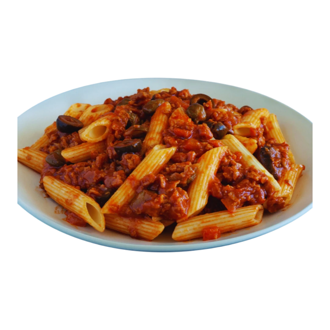 Atvum, massa, molho de tomate, azeitonas, alcaparras, alho, azeite.