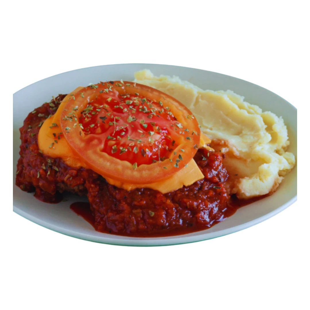 Hambúrguer vegetal, molho de tomate, queijo vegetal, ervas, arroz integral.