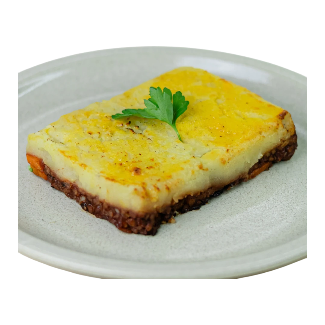 Purê de batata, proteína vegetal, cebola caramelizada, ervas e especiarias.