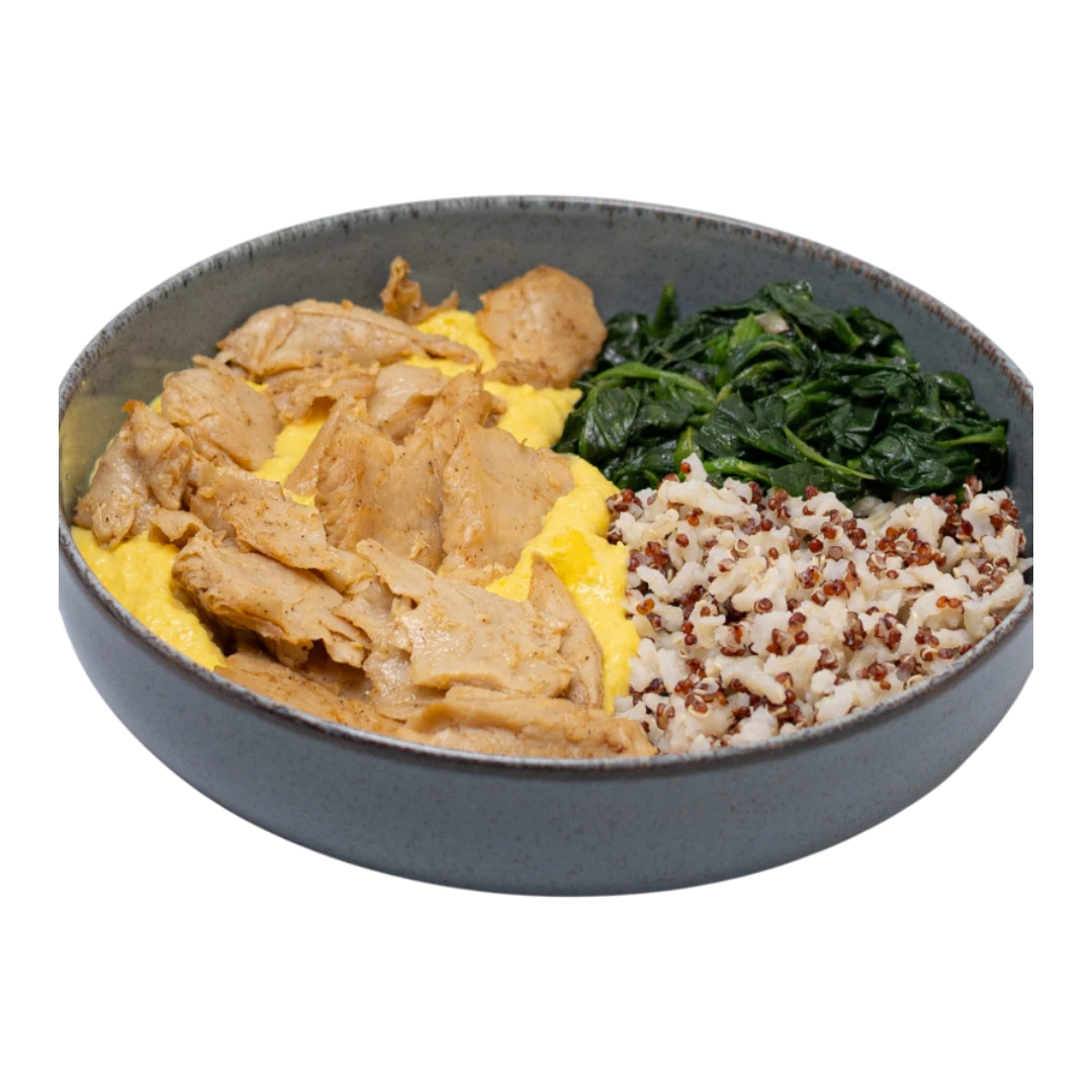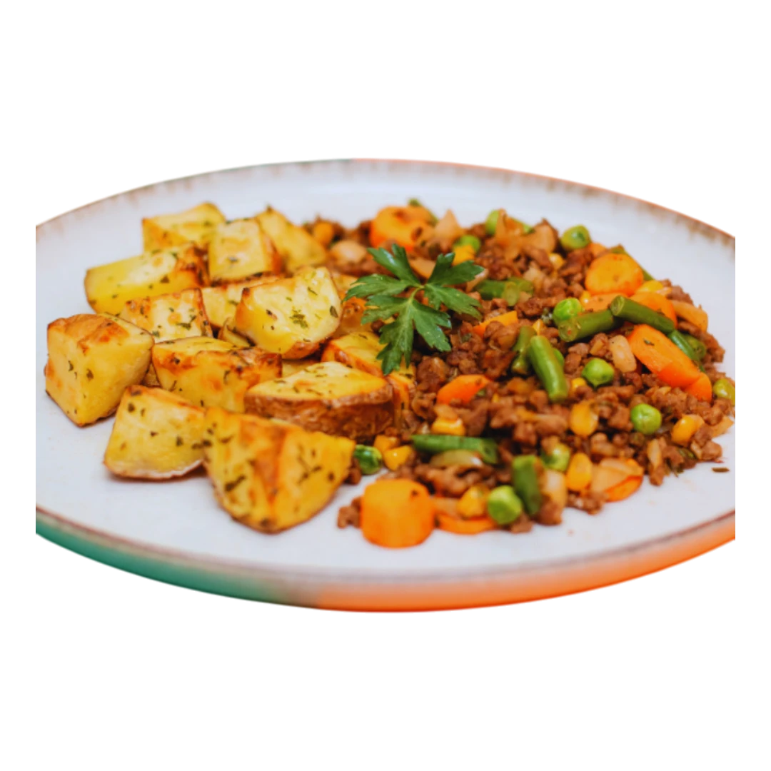 Proteína vegetal picada, batata rústica assada, ervas aromáticas, molho leve.