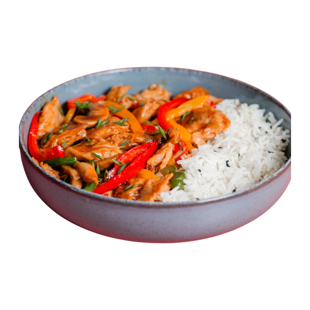 Proteína vegetal, legumes, arroz jasmim, molho teriyaki, sementes de sésamo.