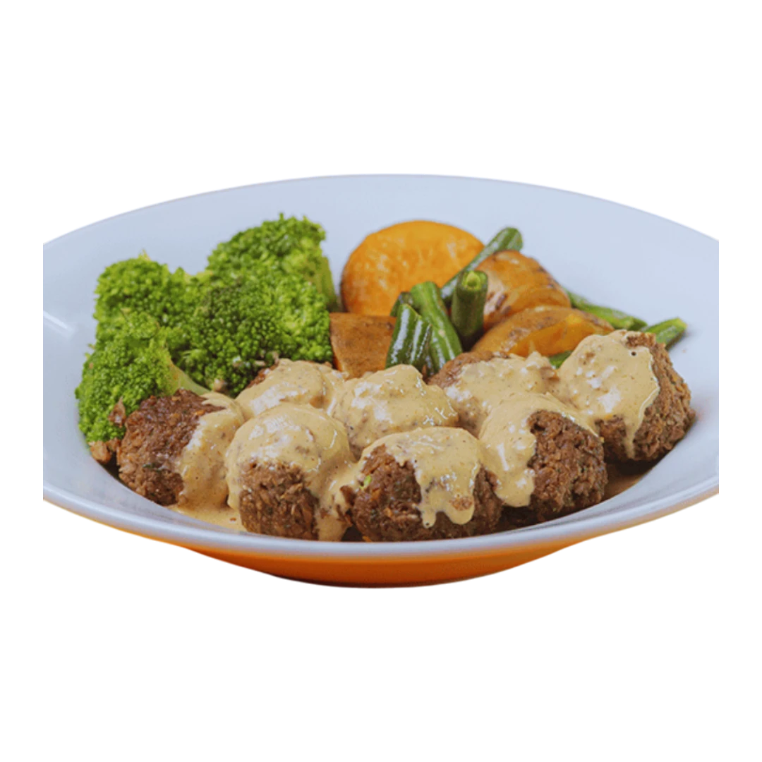 Almôndegas de carne, puré de batata, molho cremoso, cebola caramelizada, ervas.
