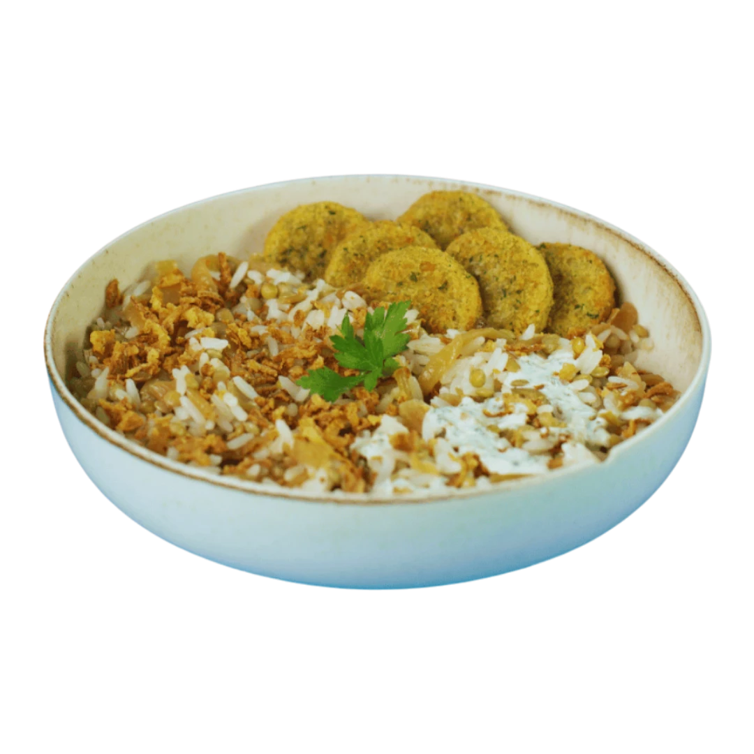 Falafel (grão-de-bico, ervas, especiarias), arroz basmati com passas, amêndoas e canela.