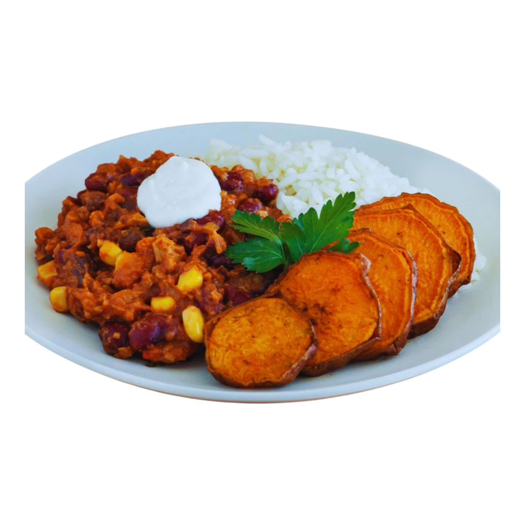 Feijão encarnado, feijão preto, seitan, tomate, cebola, especiarias.