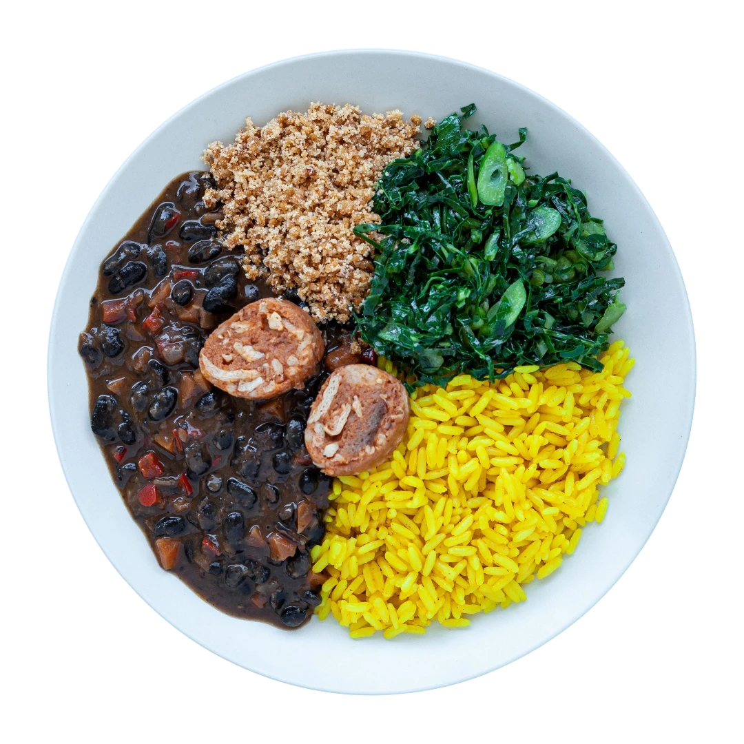 Feijão preto, carne suína, arroz branco, farofa, couve, laranja.