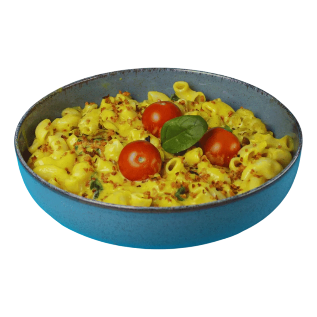 Massa de cotovelos, molho vegetal tipo queijo (batata, levedura nutricional, óleo vegetal), cúrcuma, sal.