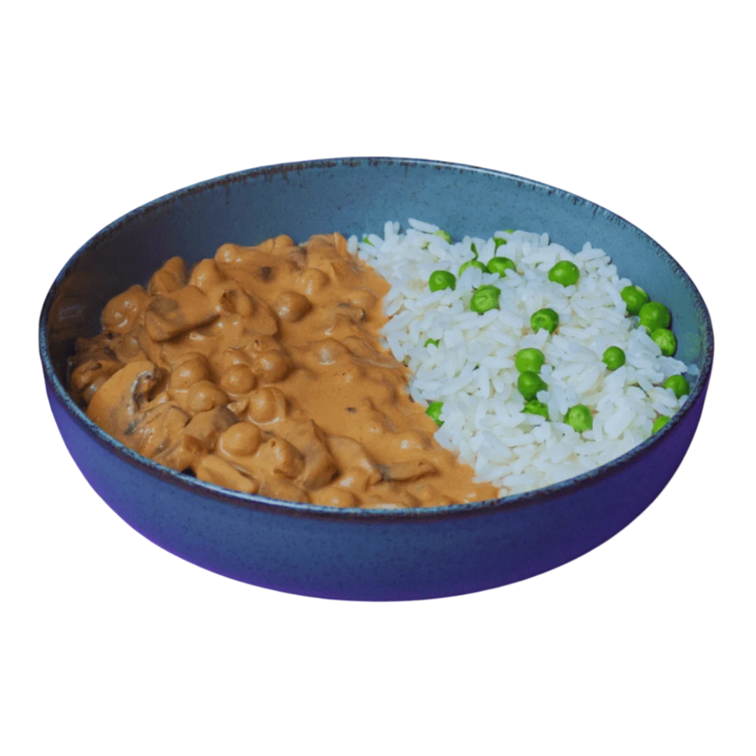 Grão-de-bico, cogumelos, natas vegetais, cebola, alho, pimenta preta.
