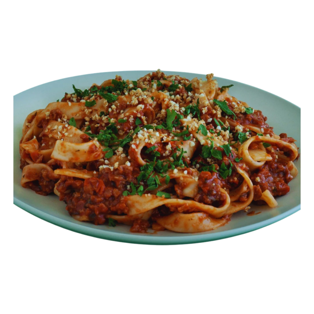 Tagliatelle, carne picada de vaca, tomate, cebola, azeite, ervas italianas.