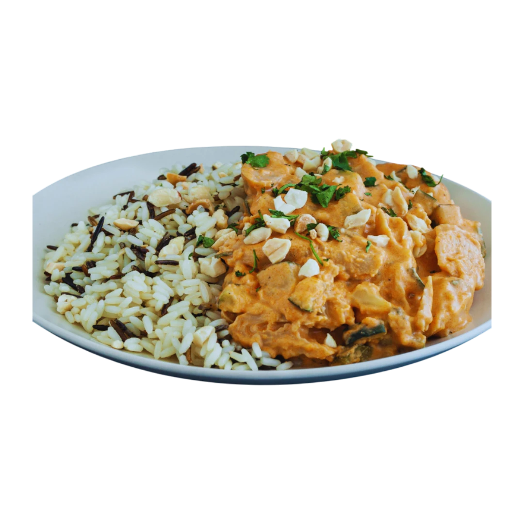 Proteína vegetal de soja, leite de coco, arroz jasmim, legumes asiáticos, especiarias thai.