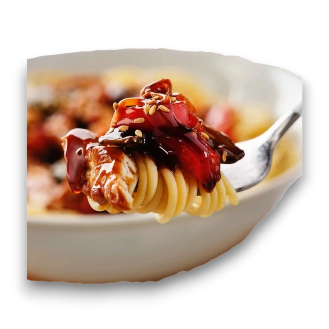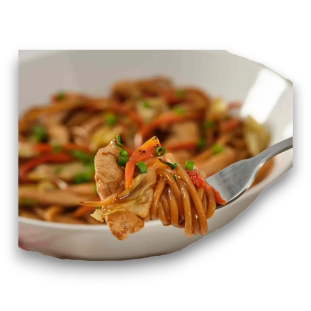 Frango, noodles de trigo integral, couve, cenoura, pimentos, molho de soja, óleo de sésamo, gengibre.