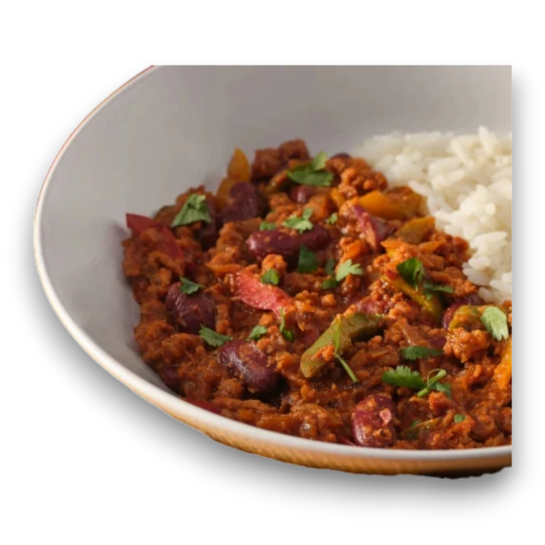 Carne picada de vaca, feijão encarnado, polpa de tomate, cebola, pimento, alho, azeite, especiarias mexicanas.