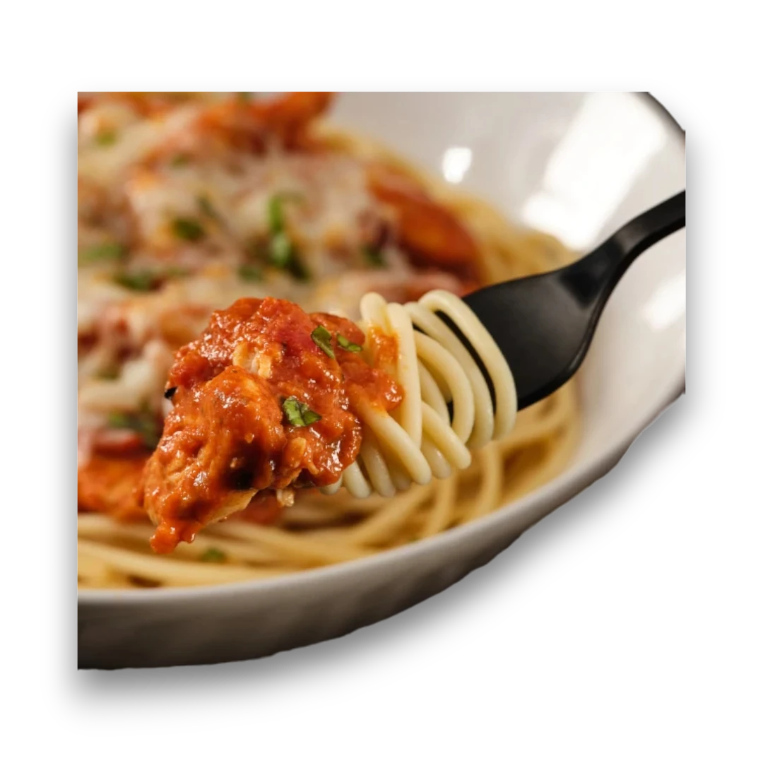 Carne de vaca magra, esparguete integral, polpa de tomate, cebola, azeite, alho, ervas italianas.