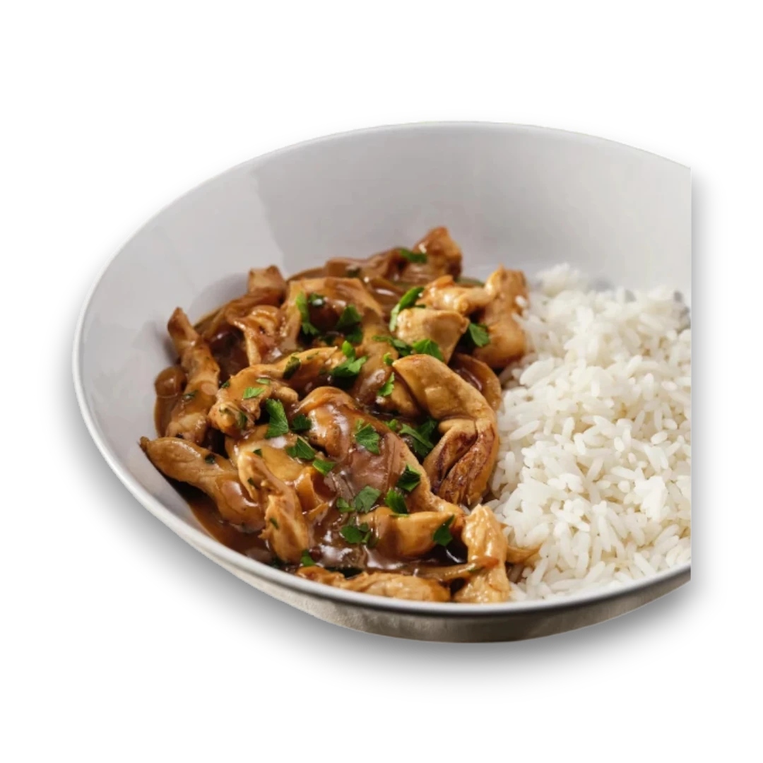 Refeição proteica de frango com arroz e molho mel e mostarda.