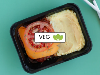 Batata roxa, Burger Heura, polpa de tomate, leite de soja, cebola, cenoura, Violife cheddar vegano, gordura vegetal, aipo, azeite, alho, orégãos, manjericão, noz-moscada.