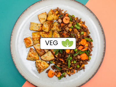 Batata, picado vegetal (proteína de soja), cebola, cenoura, feijão verde, milho, ervilha, polpa de tomate, nata vegetal (soja), azeite, sal, orégãos, salsa, alho, páprica, pimenta preta.
