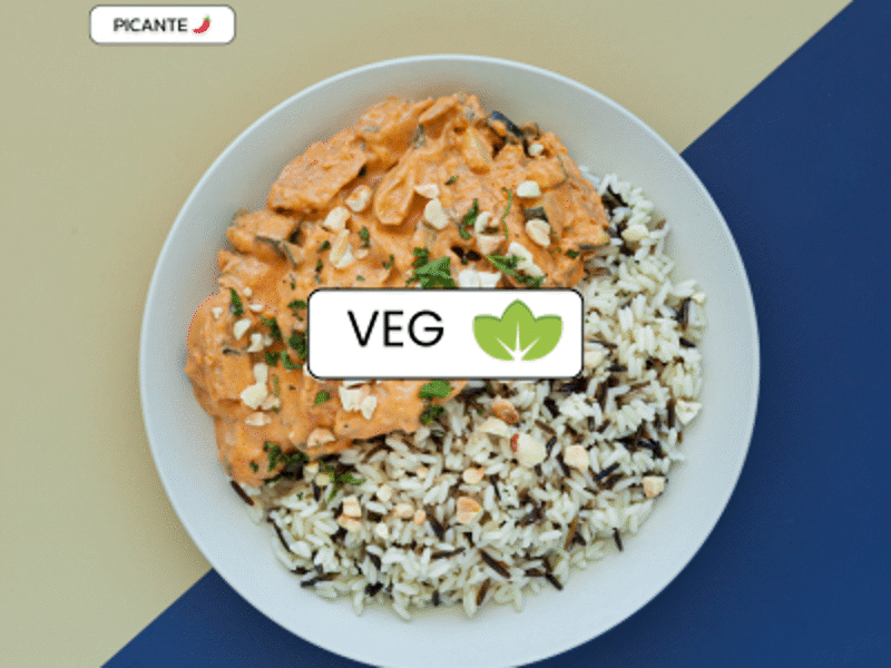 Arroz selvagem, leite de coco, frango do futuro, curgete, bebida de soja e aveia, cebola, amendoim, pasta de amendoim, pasta de caril vermelho, óleo de sésamo, sal, azeite, coentro, casca de limão, pimenta preta.